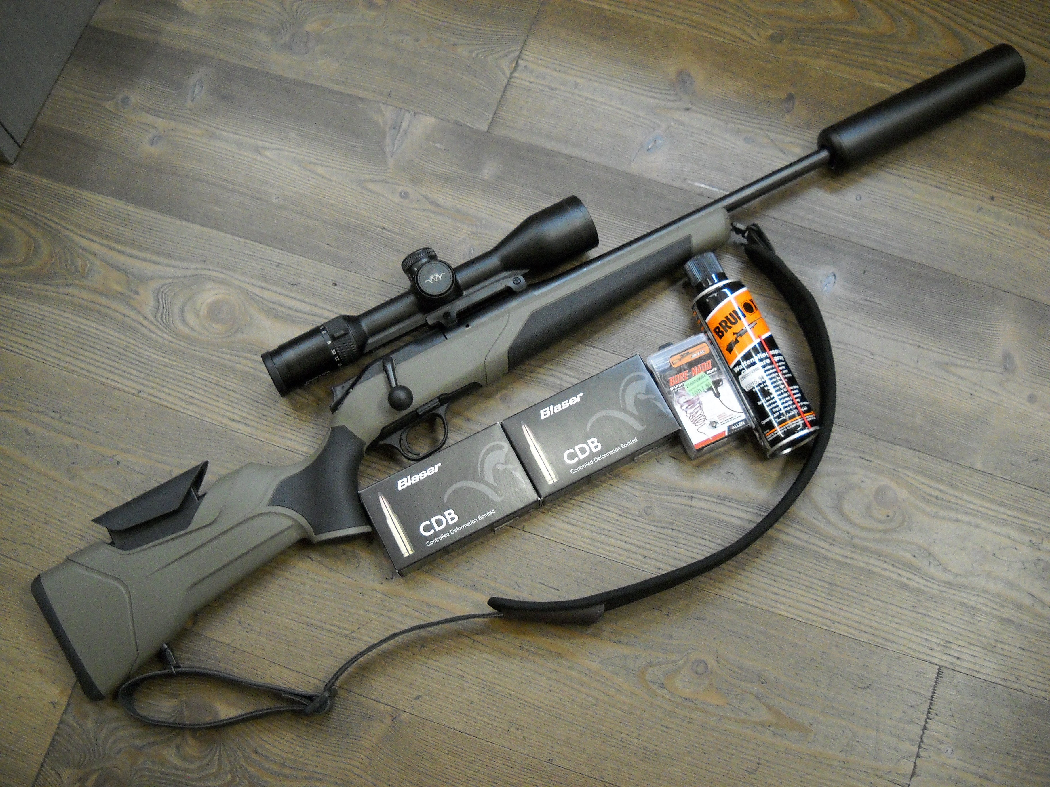 Blaser Set R8 Professional 2.0 Dark Olive im Kal. 308 Win. 52 cm Lauf ZF Blaser B2 3-18x50 IC und Schalldämpfer Over Barrel, 40 Stk. Blaser Munition, Gewehrriemen, Putzschnur und Waffenspray Brunnox im Set statt € 7.411,00 nur € 6.500,00